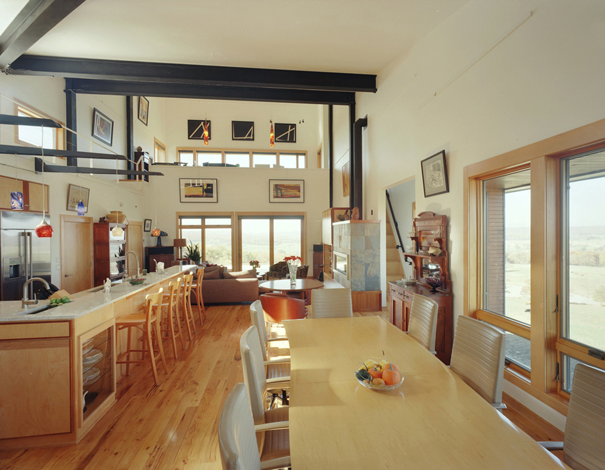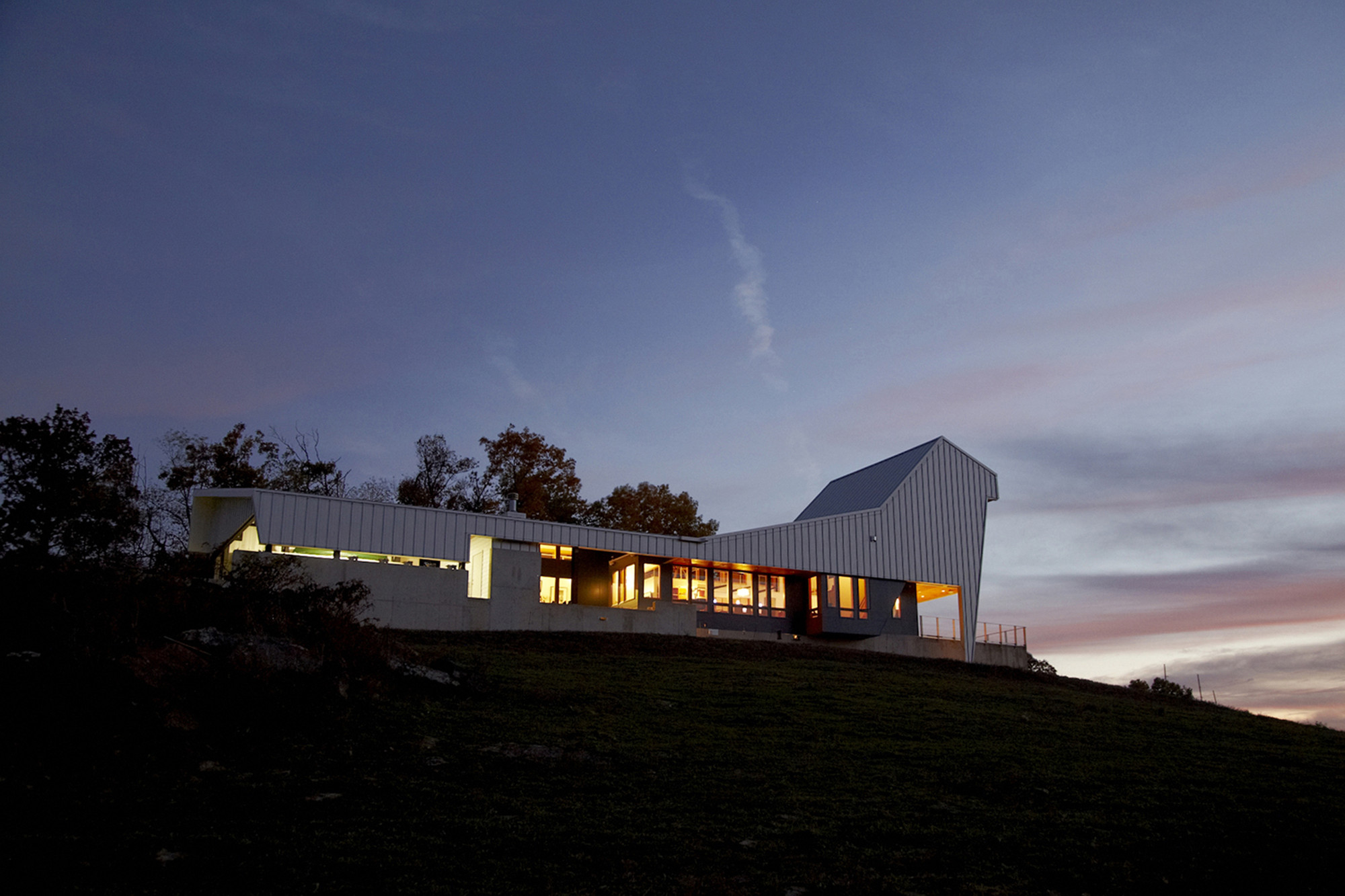 The Round Mountain House references local precedents by combining modernist ideals with vernacular strategies to integrate seamlessly into the Ozark Mountain landscape.