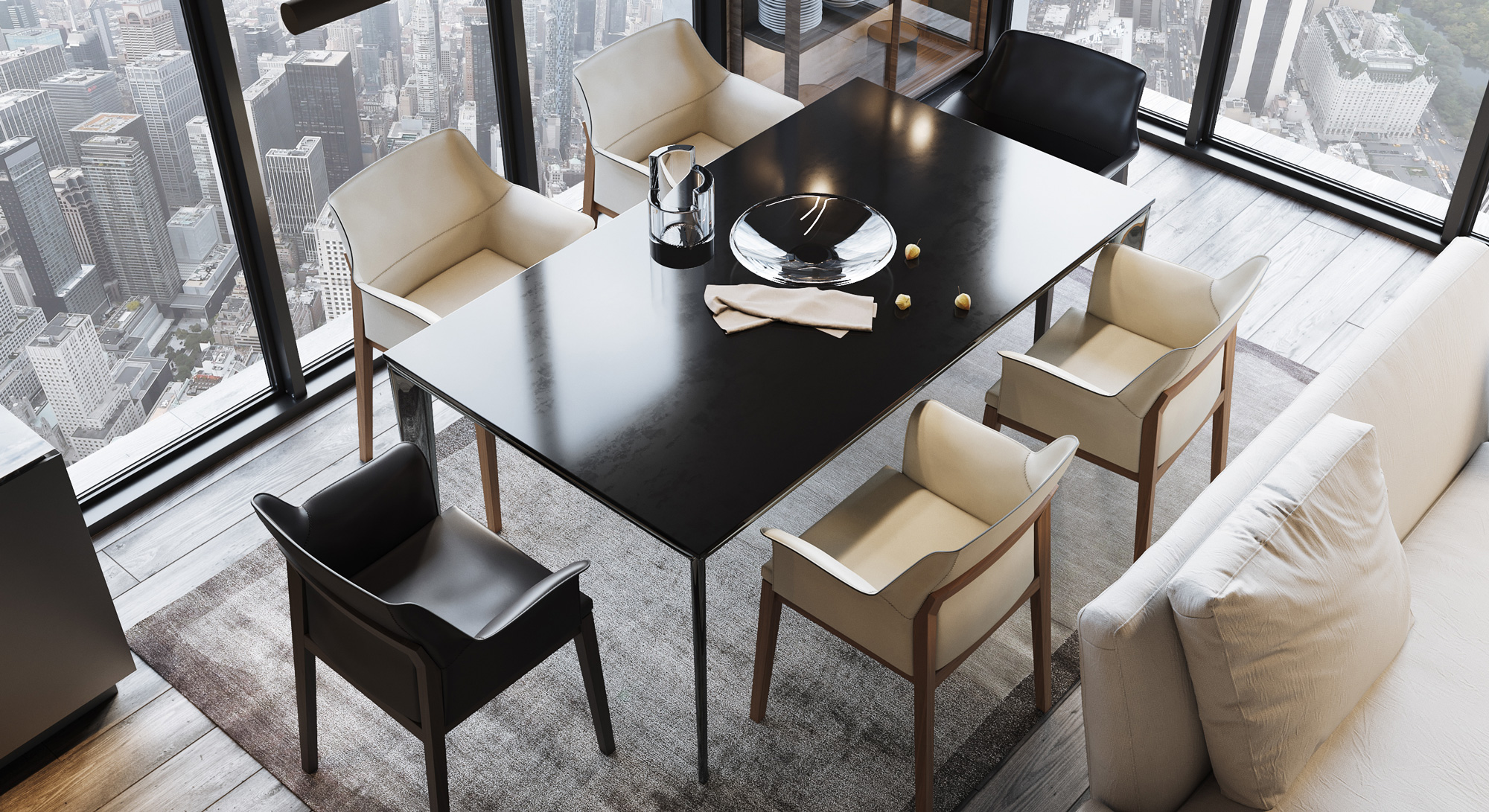 Designers, iconic furniture was used to achieve elegant, sophisticated look.
